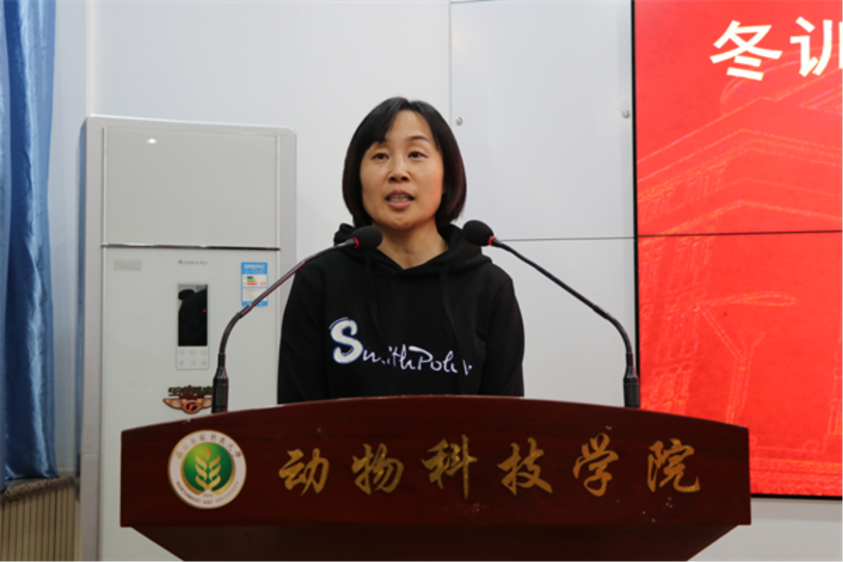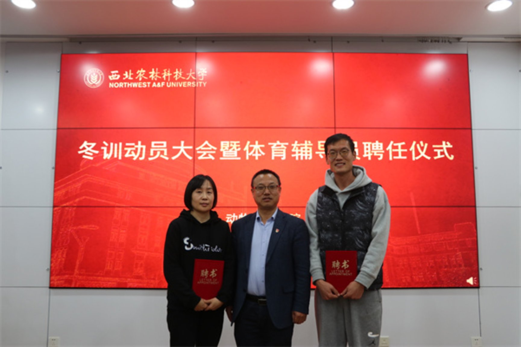 会上,张明侠宣读了聘任文件,由王力为体育辅导员颁发聘书。新聘体育辅导员陈艳教授表示非常高兴能加入到动科学院大家庭,并希望能在接下来的一年中陪伴大家一起愉快的度过。“我将会利用自己对体育的认识与理解,利用自己掌握的科学方法,引领大家愉悦身心,保持身体健康。”陈艳说到。