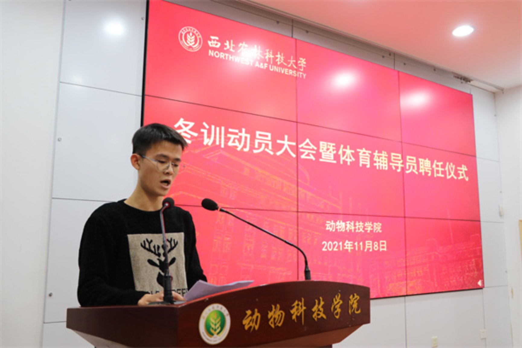 11月8日下午,学院在107会议室举行动物科技学院2021年冬训动员大会暨动科学院体育辅导员聘任仪式。学院党委副书记王力,体育辅导员陈艳、冯鑫,全体专兼职辅导员及参与冬训的学生代表参加会议。辅导员冯来顺主持会议。