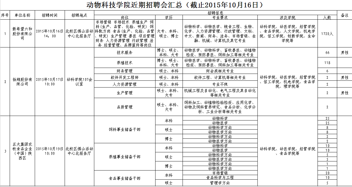 动物科技学院近期招聘会汇总(截止2015年10月16日)