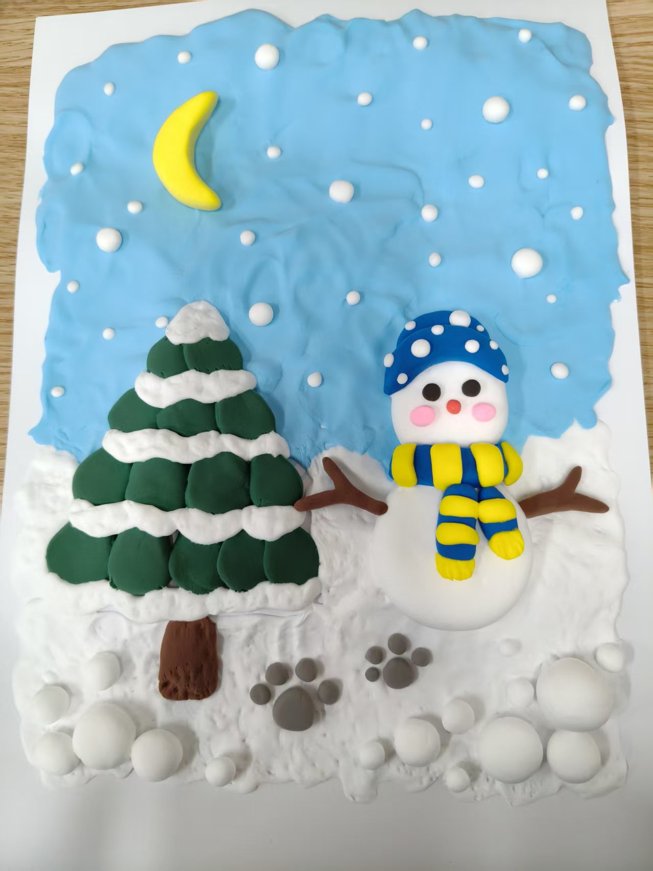 活动现场,超轻黏土、白纸等材料工具一应俱全。同学们以“冬日”为灵感自由创作,指尖捏塑出诸多鲜活场景:有色彩斑斓如拱桥的彩虹搭配笑脸云朵,定格雨后放晴的美好;也有雪夜中围彩条围巾的雪人、覆雪的松树,在弯月与雪花点缀下勾勒出静谧浪漫……从自然景致到创意形象,大家将暖冬记忆化作掌心的黏土作品。