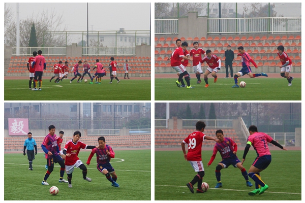 比赛开始,上半场,双方球员就进入了胶着状态,两方队员实力不相上下。随着队员们逐渐进入状态,我院选手们展开了强有力的猛攻,凭借精湛的技术,6号球员姚一博叩开了对手的球门,先下一城,将比分改写为1:0。随后,我院选手积极防守,利用身体优势构建铜墙铁壁进行阻击,成功将上半场比分定格为1:0。下半场我院队员再接再厉,从单纯防守防守转换为以攻为防的战术,利用8号、11号的逼抢,不断给对方造成威胁,同时缓解我方后场的压力。终于,在下半场开场10分钟左右,我院选手利用一次任意球机会,经过门前多次传射,再一次攻破对方的球门,并最终将比分定格到2:0,成功夺得冠军。