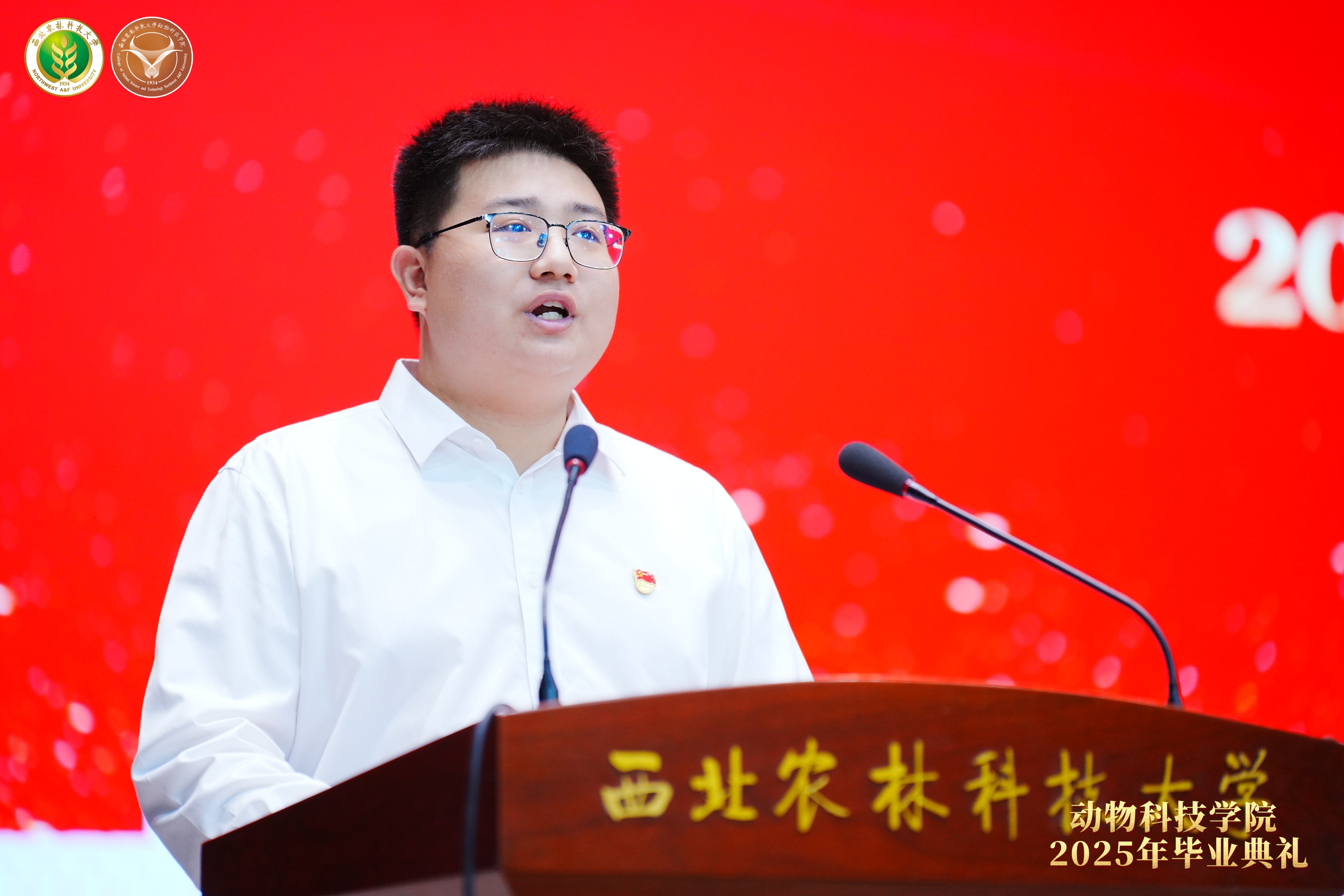2021级动物科学专业本科生张琨玉、2022级动物遗传育种与繁殖专业宋清川、2021级动物营养与饲料学专业博士罗小龙作为毕业生代表发言。他们回顾了在西农的求学生涯,回忆了师生情、同窗情,表达了对学院和老师的感恩与不舍,以及对母校的美好祝愿。曹阳春教授作为教师代表发言,鼓励毕业生们在农业革命重塑世界之际,铭记“畜德自牧”的初心为立身之本;“富饶天下”的宏愿作毕生追求。