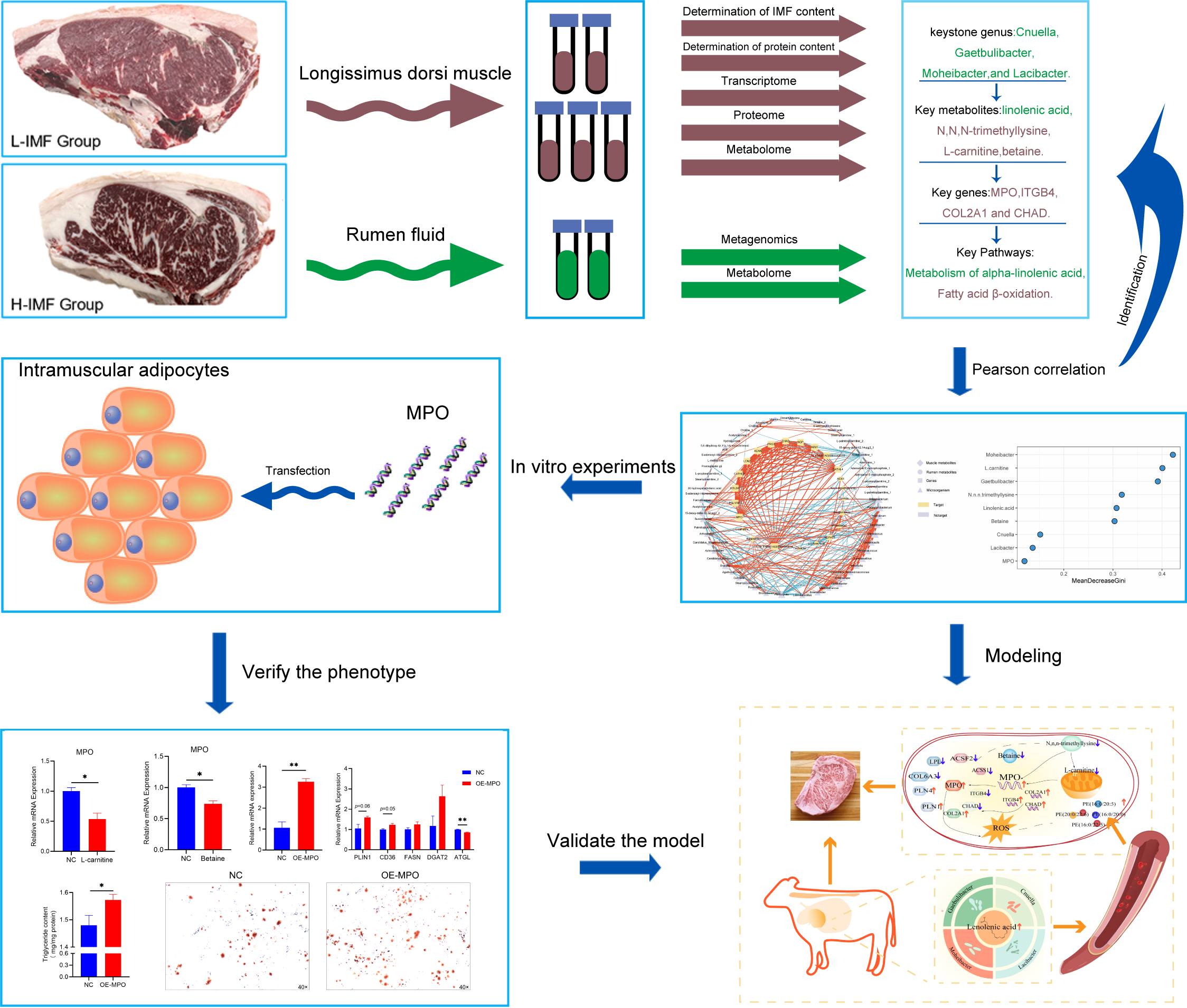 在此基础上,采用随机森林等机器学习方法对多组学中筛选出的关键微生物、代谢物及宿主基因进行了综合评估,系统量化了各因子对肌内脂肪表型的贡献度。结果表明,Moheibacter、Gaetbulibacter、Cnuella、Lacibacter、L-肉碱、N,N,N-三甲基赖氨酸、α-亚麻酸、甜菜碱及 MPO 等共同构成了调控肌内脂肪沉积的关键因子群,其中 Moheibacter的重要性位居前列,L-肉碱亦呈较高贡献,说明了特定瘤胃菌群及脂肪酸β-氧化/L-肉碱代谢轴在肌内脂肪形成中的核心作用。体外细胞实验进一步证实,过表达 MPO 基因可显著增强脂肪细胞脂质生成,而 L-肉碱和甜菜碱能通过抑制 MPO 基因表达,间接调控这一过程。
