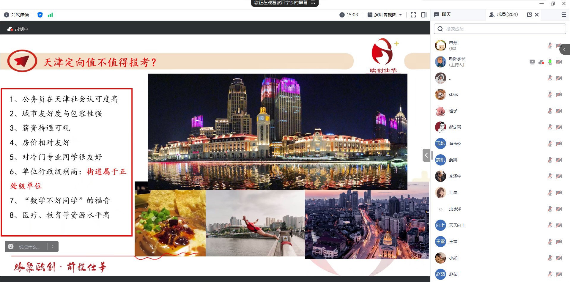 为了进一步抓住“秋招”关键期,全力促进毕业生“早就业,就好业”,学院联合动医学院于12月13号晚举办了天津定向选调及三支一扶政策解读会。会议邀请了欧创仕华的慕辰老师担任主讲人,近两百名意向考公的毕业生、非毕业生线上参加了此次报告会。